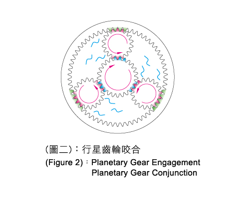 高扭力、耐衝击:行星齿轮之结构异同于传统平行齿轮之运转方式。传统齿轮仅依靠两个齿轮间极少数点接触面挤压驱动,所有负荷集中于相接触之少数齿轮面(图一),容易产生齿轮之摩擦与断裂。