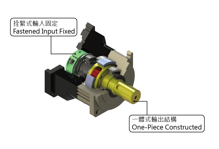 行星齿轮固定架及出力轴一体成形设计,可达到最大扭转刚性及出力轴高劲向负载能力。